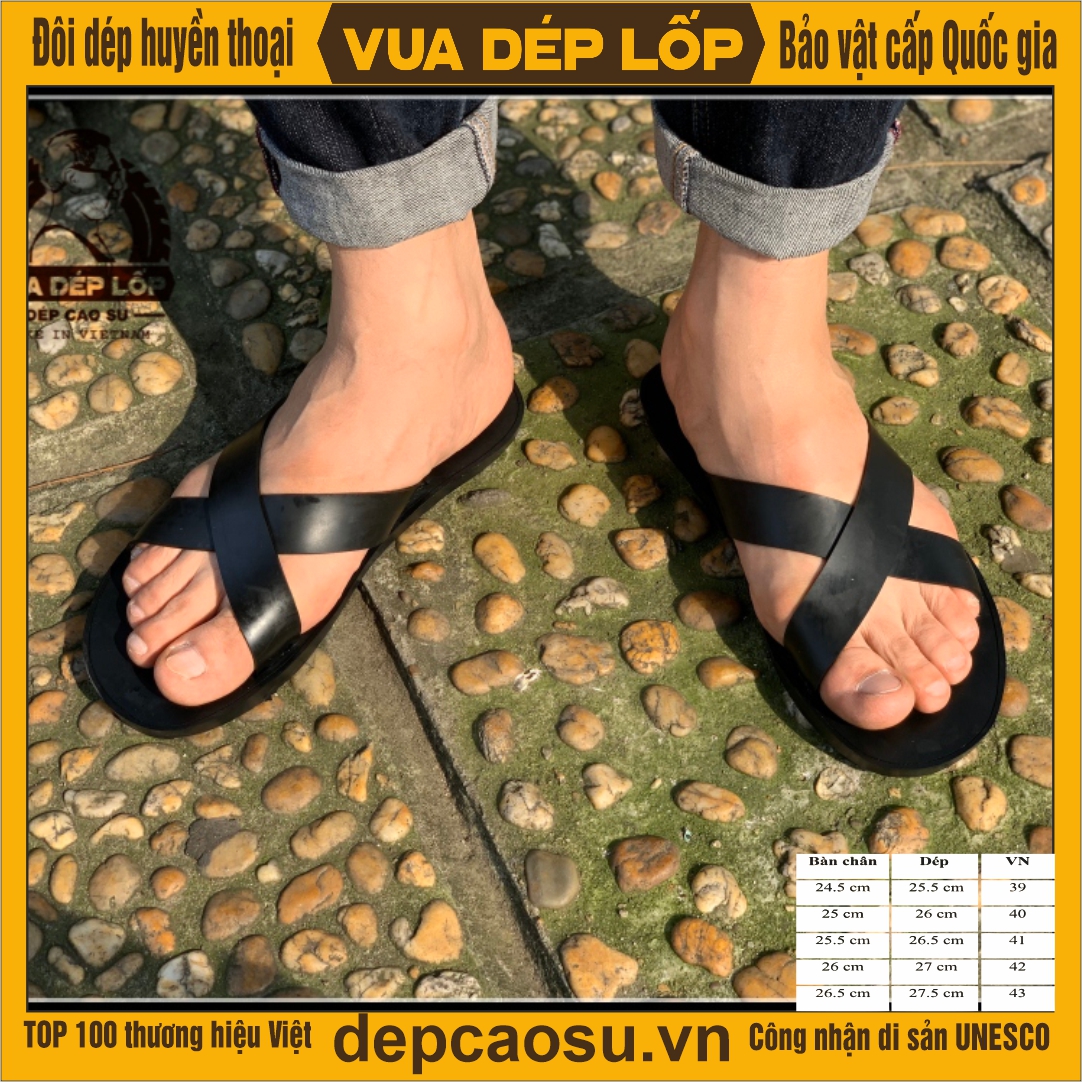 Thiết kế mẫu mã đẹp, hợp thời trang, tinh xảo từ bàn tay người nghệ nhân - Vua dép lốp Phạm Quang Xuân. Kiểu dáng dép 2 quai đan chéo màu đen, ôm sát bề mặt chân mang lại cảm giác thoải mái khi đi. Dép được làm thủ công, có đường viền khắc chìm xung quanh, dưới đế được khoét chống trơn trượt, có rãnh thoát nước. Đầu dép được làm cong, quai dép to và dầy, ôm chân và vừa form. Chất liệu cao su lốp oto đi mềm mại và rất bền, đế cao su dày khoảng 1cm tạo cảm giác chắc chắn và không nặng nề.