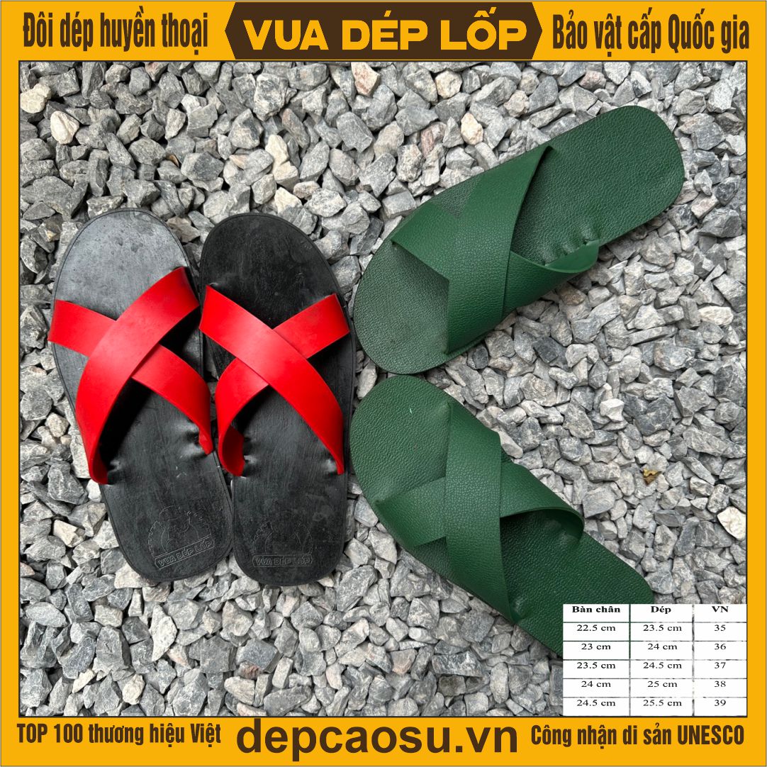 người nghệ nhân - Vua dép lốp Phạm Quang Xuân. Kiểu dáng dép 2 quai đan chéo màu đỏ nổi bật, ôm sát bề mặt chân mang lại cảm giác thoải mái khi đi. Dép được làm thủ công, có đường viền khắc chìm xung quanh, dưới đế được khoét chống trơn trượt, có rãnh thoát nước. Đầu dép được làm cong, quai dép to và dầy, ôm chân và vừa form. Chất liệu cao su lốp oto đi mềm mại và rất bền, đế cao su dày khoảng 1cm tạo cảm giác chắc chắn và không nặng nề.