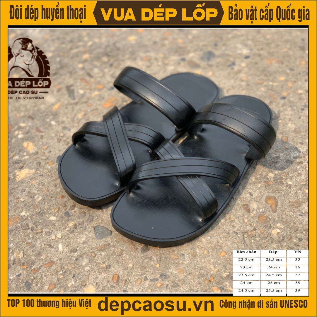 Thiết kế mẫu mã đẹp, hợp thời trang, tinh xảo từ bàn tay nghệ nhân - Vua dép lốp Phạm Quang Xuân. Kiểu dáng dép lê 3 quai chéo, ôm sát bề mặt chân mang lại cảm giác thoải mái khi đi. Dép được làm thủ công, có đường viền khắc chìm xung quanh, dưới đế được khoét chống trơn trượt, có rãnh thoát nước. Đầu dép được làm cong, quai dép to và dầy, ôm chân và vừa form. Chất liệu cao su lốp oto đi mềm mại và rất bền, đế cao su dày khoảng 1cm tạo cảm giác chắc chắn và không nặng nề.