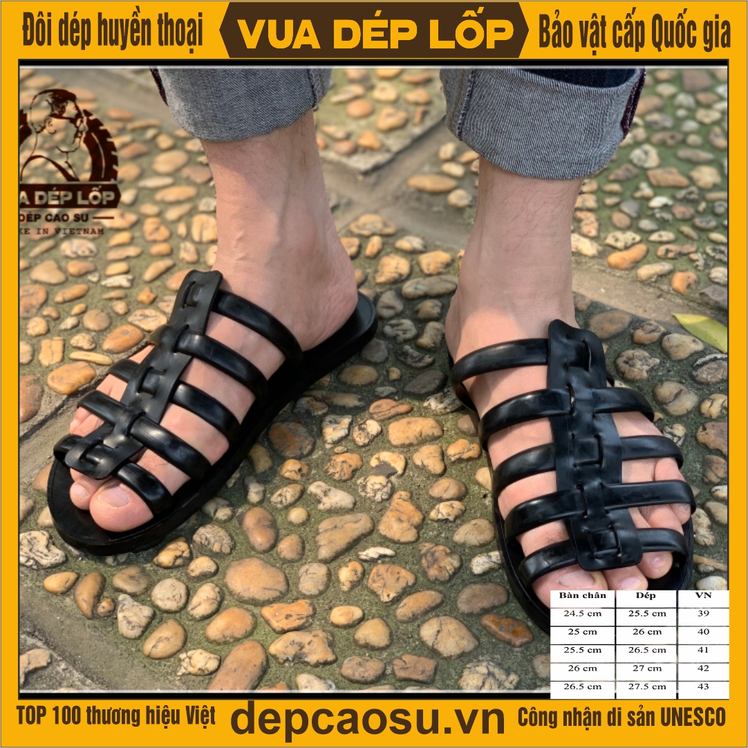 người nghệ nhân - Vua dép lốp Phạm Quang Xuân. Kiểu dáng 5 quai dép ôm sát bề mặt chân mang lại cảm giác thoải mái khi đi. Dép được làm thủ công, có đường viền khắc chìm xung quanh, dưới đế được khoét chống trơn trượt, có rãnh thoát nước. Đầu dép được làm cong, quai dép to và dầy, ôm chân và vừa form. Chất liệu cao su lốp oto đi mềm mại và rất bền, đế cao su dày khoảng 1cm tạo cảm giác chắc chắn và không nặng nề.